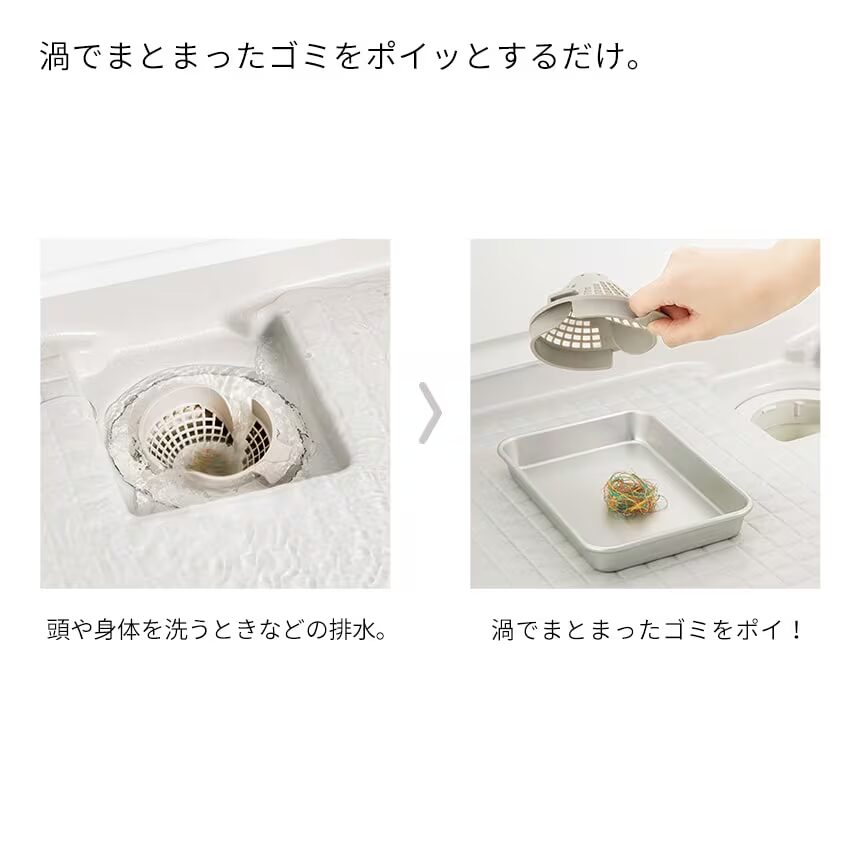 シャワーなどの排水時に髪の毛やごみをキャッチャーの中央に渦を起こしながら中央にパッとまとめます。