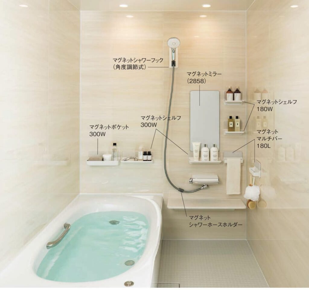 お風呂での過ごし方やお好みの雰囲気に合ったお風呂や、お掃除の面でもマグネット式のものや床の汚れがつきにくく、冷っとしにくい「キレイサーモフロア」など毎日使うものはお掃除を楽に、そしてきれいに保ち続けたいものです。