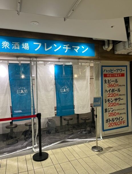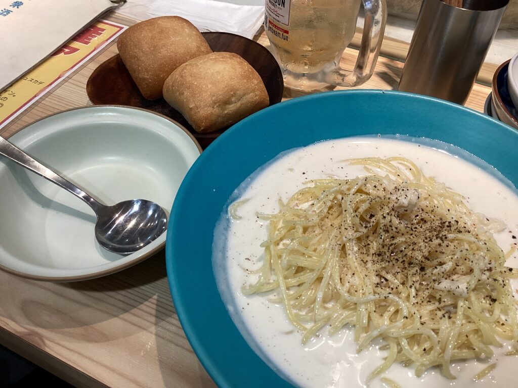 かなりお腹いっぱいになりましたが、折角なのでフランス料理を〆にすることにしました。2025年3月にオープンしてばかりの「大衆酒場 フレンチマン」。グランフェスタ2番街にあります。全国で10店舗ほどあるとのこと。今回の指定メニューは「ホールチーズのクリームパスタ」。コク深いイタリア産の「グラナパダーノ」贅沢に味わえる逸品です。