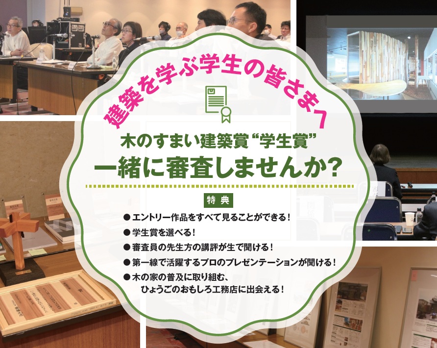 さて、12月6日(土)に開催する第6回「木のすまい建築賞 in 兵庫」では、今年度から建築を学ぶ学生の皆さんにも審査に加わっていただき「学生賞」を選んでもらおうと企画しております。