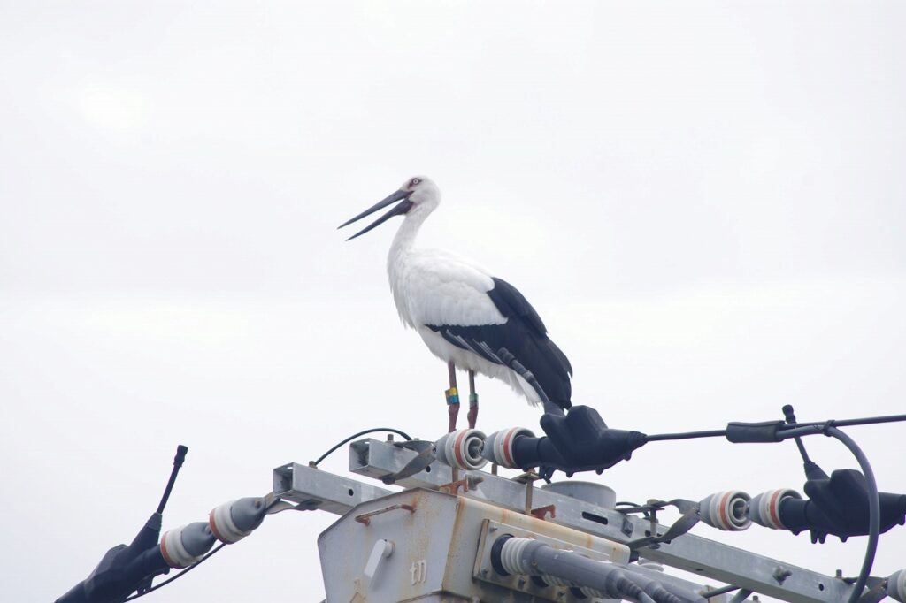 何だろうと気になり覗いてみると電柱の上にコウノトリが止まっています
