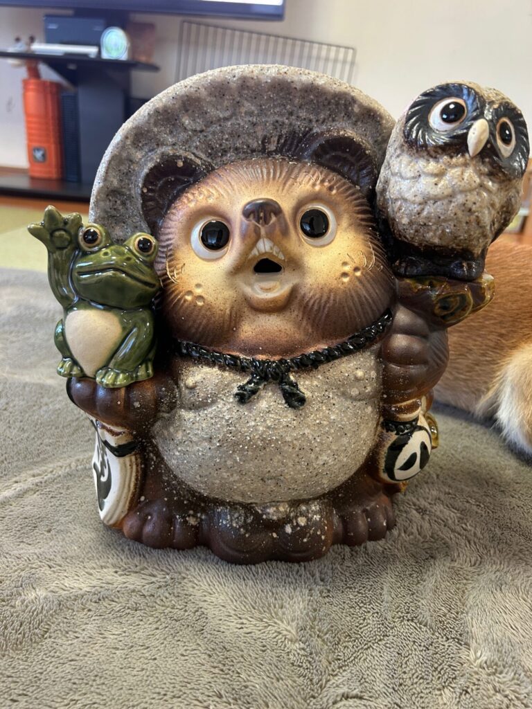 タヌキと一緒にカエルとフクロウをのせているものを迎い入れました。