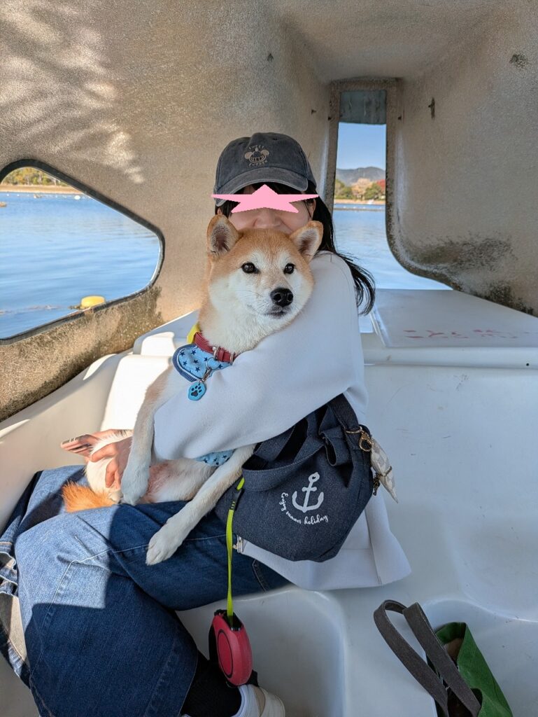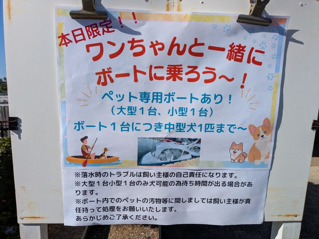 ペット専用ボートを大型1台と小型1台、準備していました。なんと中型犬もOKだったんで、「小春」と「ノア」の二匹と人間3人全員が大型ボートに乗船できました。普段は無理な企画だと思うんですがドッグフェスなので特別企画ですね。